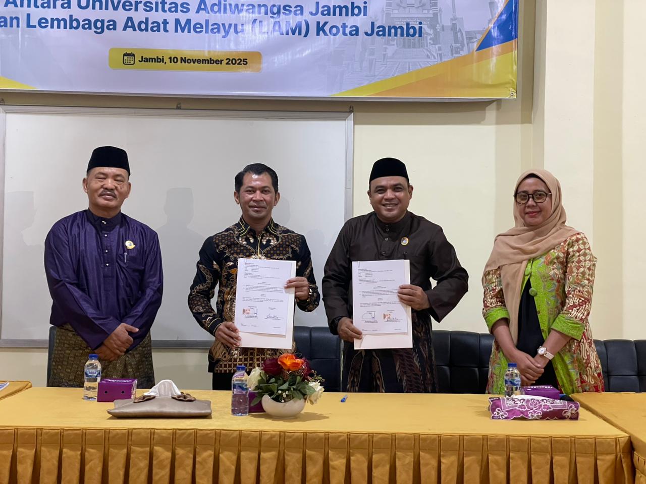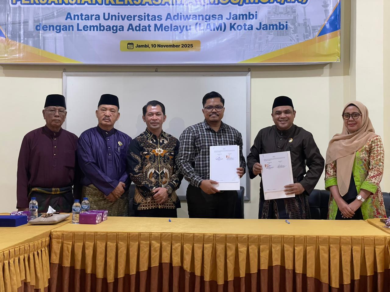 Universitas Adiwangsa Jambi (UNAJA) kembali menunjukkan komitmennya sebagai kampus swasta terbaik di Jambi dengan menjalin kerja sama strategis bersama Lembaga Adat Melayu (LAM) Kota Jambi. Penandatanganan perjanjian kerjasama (MoU/MoA/IA) tersebut berlangsung di Aula UNAJA dan disaksikan langsung oleh jajaran pimpinan kampus serta para pengurus LAM Kota Jambi. Kolaborasi ini diharapkan mampu memperkuat sinergi antara dunia pendidikan dan lembaga adat dalam melestarikan nilai-nilai budaya Melayu di Kota Jambi.