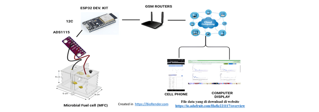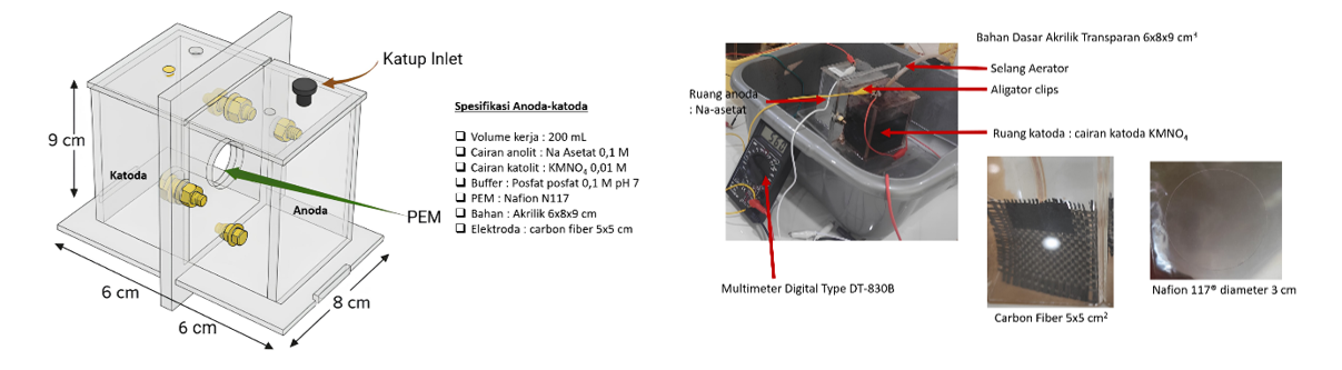 Sistem MFC dirakit menggunakan bahan akrilik dua ruang (dual-chamber) dengan membran Nafion N117® sebagai pemisah anoda dan katoda. Elektroda berbahan karbon fiber digunakan sebagai penghantar elektron. Seluruh sistem diuji menggunakan mode open circuit voltage (OCV) dan close circuit voltage (CCV) selama lebih dari 75 jam.