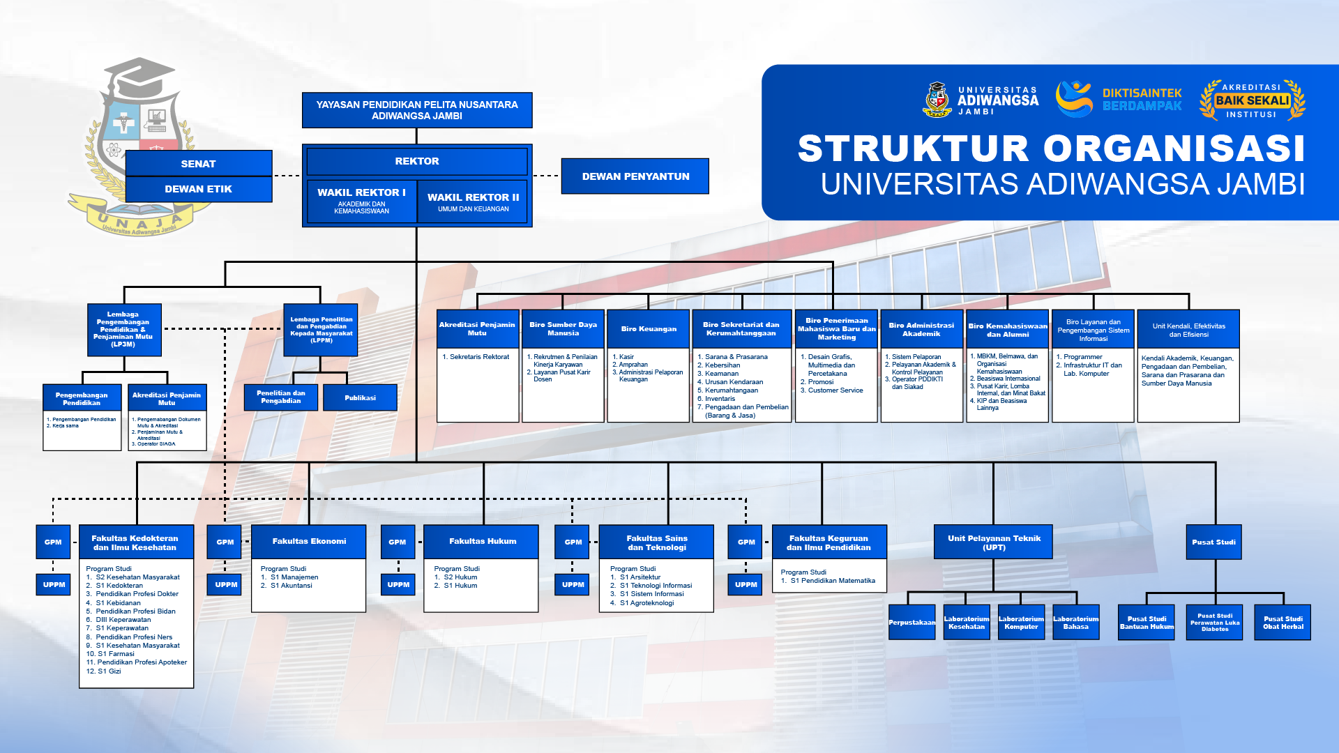 Struktur Organisasi Universitas Adiwangsa Jambi disusun secara sistematis untuk menjamin tata kelola perguruan tinggi yang profesional, transparan, dan akuntabel.